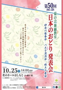2025-09-28 富士見市にて発表会が開催決定! 日本のおどり 『第50回菊の会教室発表会』 -埼玉東籬会・埼玉菊陽会・埼玉千寿会・神奈川菊香会・越谷菊栄会-日 付:2025年9月28日(日)会 場:キラリ☆ふじみ(メインホール) 地図開演時間:14:00開演(開場30分前)料 金:入場無料 但し、チケットをお持ちでない方はご入場できません。 チケットのお求めは、出演者または菊の会事務局に お申込みください。 Tweet